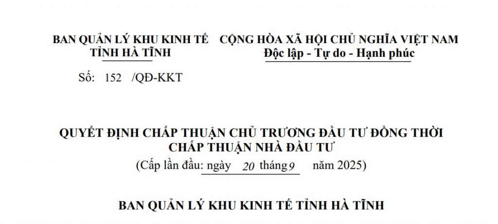 Cụ thể, doanh nghiệp được tỉnh Hà Tĩnh cấp quyết định cho dự án đầu tư xây dựng nhà xưởng cho thuê sản xuất ngành phụ trợ ô tô điện (mã ngành theo VSIC: 6810).